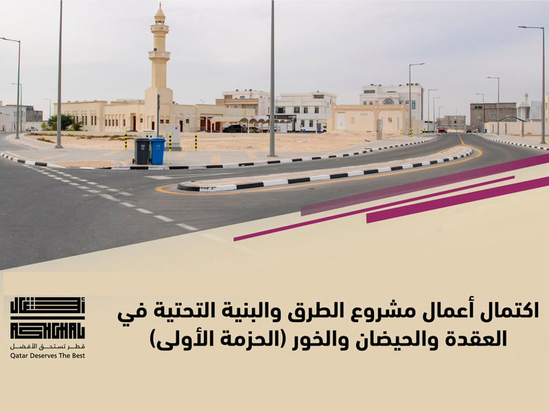 أعلنت هيئة الأشغال العامة "أشغال" عن اكتمال جميع أعمال الحزمة الأولى من مشروع تطوير الطرق والبنية التحتية في العقدة والحيضان والخور. يخدم المشروع أراضي المواطنين الجديدة بالمنطقة التي تقع غرب استاد البيت، تحديدًا شمال طريق الخور الساحلي وشارع العقدة وغرب شارع الحيضان، وذلك من خلال إنشاء شبكة شوارع داخلية وتوفير مرافق متطوّرة للبنية التحتية تلبي احتياجات السكان وتواكب متطلبات النمو والتوسع العمراني المستقبلي.