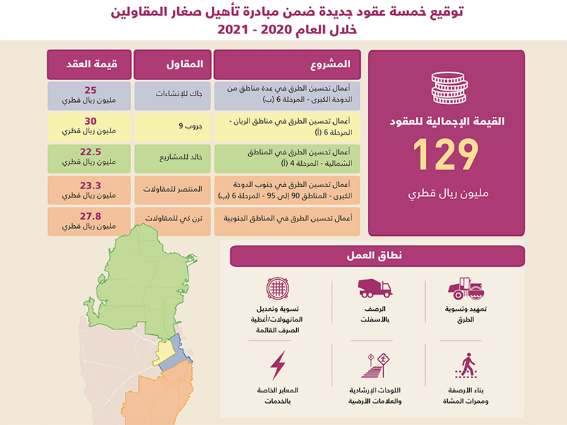 ويجدر الذكر أنه خلال السنتين 2020 و2021، تم ترسية خمسة عقود جديدة لمشاريع أعمال تحسين الطرق على مقاولين قطريين، بقيمة إجمالية تبلغ حوالي 129 مليون ريال قطري ضمن مبادرة "تأهيل صغار المقاولين"
