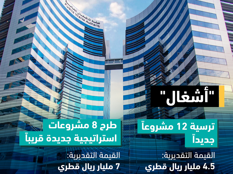 وتشير "أشغال" إلى أنه تم إرساء 12 مشروعًا جديدًا بقيمة إجمالية تتجاوز 4.5 مليار ريال قطري، تشمل ستة مشاريع مبانٍ حيوية، من أبرزها مشروع تطوير مستشفى حمد العام، ومشروع تصميم وتنفيذ مبنى البريد بمنطقة الثمامة. كما تتضمن المشاريع تجديد نادي السباق والفروسية والاتحاد القطري للفروسية، إضافةً إلى تنفيذ المرحلة الرابعة من تطوير مجمع العقدة للفروسية.