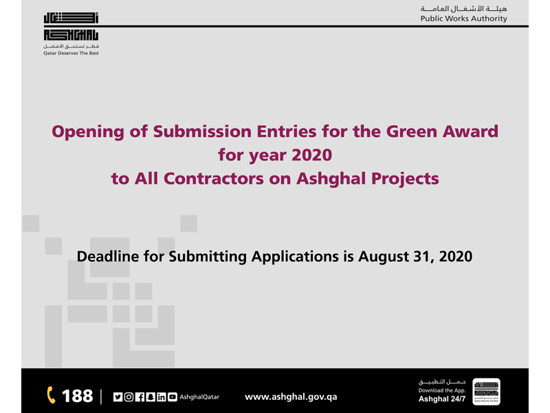 The Public Works Authority ‘Ashghal’ has announced the opening of the submission entries for the Green Award for year 2020, which is now expanded to include all the contractors of Ashghal’s on-going projects under the Project Affairs, and is no longer limited to the projects within Ashghal’s Roads Projects Department (RPD).