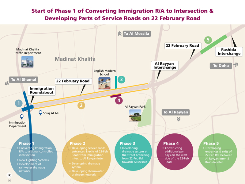 The third phase includes developing the drainage system at the road branching from the 22-February Road towards Al Messila area (between the new health centre and the English Modern School). The fourth phase includes the construction of additional parking bays on the west side of 22-February Road, while the fifth and final phase includes the development of the entrances and exits of the 22-February road in the area between Al Rayyan Interchange and Rashida Interchange.