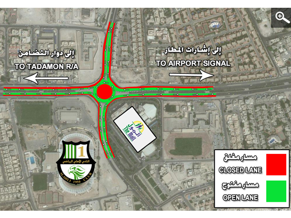 Ashghal executed the construction of the side expansions of the Mall Roundabout. Closing the parts marked with red color as shown on the map and putting guidelines panels and traffic signals (according to the map).