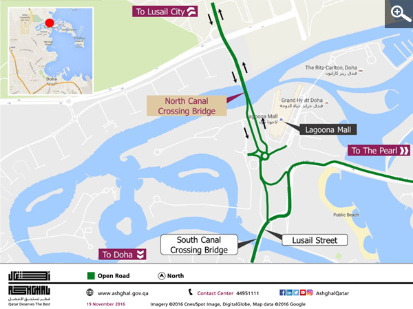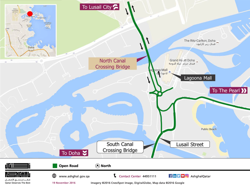 Located between the Lusail City and north of the Pearl Interchange currently under construction, the North Canal Crossing Bridge will be a 200-meter-long vital crossing. The opened part of the bridge will provide two lanes in each direction and it forms a section of the permanent road. The North Canal Crossing Bridge upgrade is due to be completed in the final quarter of 2017.