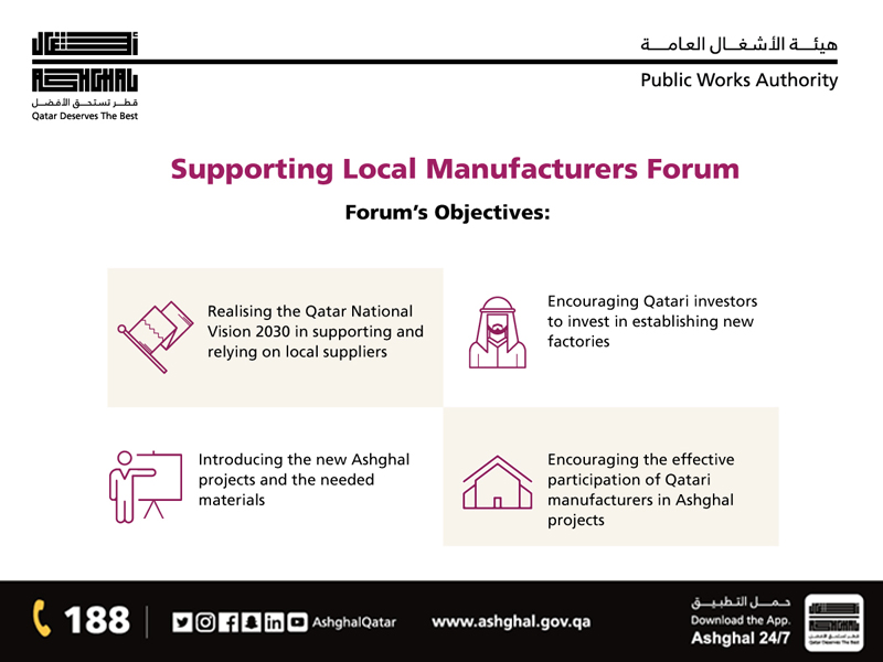 As part of its efforts to support the local product through its projects, the Public Works Authority ‘Ashghal’ announced that it will hold “Supporting Local Manufacturers Forum” in September, with the participation of Ashghal’s international and local contractors implementing various projects, in addition to the qualified local factories. The forum will provide an important opportunity to the new and the qualified Qatari factories to learn about the new Ashghal projects and the needed materials.