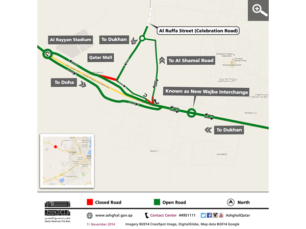 As part of its work on Dukhan Highway – Central, and to complete the road works on the new interchange near Al Rayyan Club on Dukhan Road (known as Rawdat Rashed Interchange), starting on Wednesday 12th of November the Public Works Authority ‘Ashghal’ will re-align the access to and from Celebration Road from Dukhan Highway as shown in the attached map.