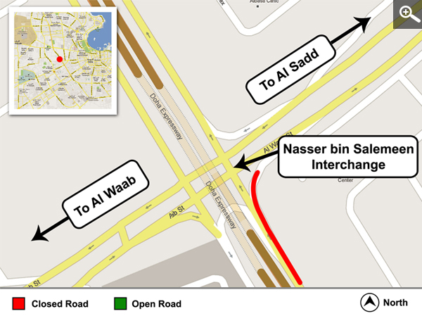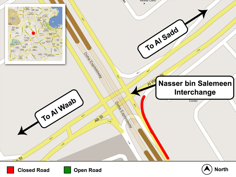 The Public Works Authority ‘Ashghal’ announces a temporary traffic diversion at Nasser bin Salemein Al Suwaidi Interchange (formerly Soudan Roundabout) above Doha Expressway on the road heading from Al Nasr Street (New Mirqab Street) towards Sadd Street.